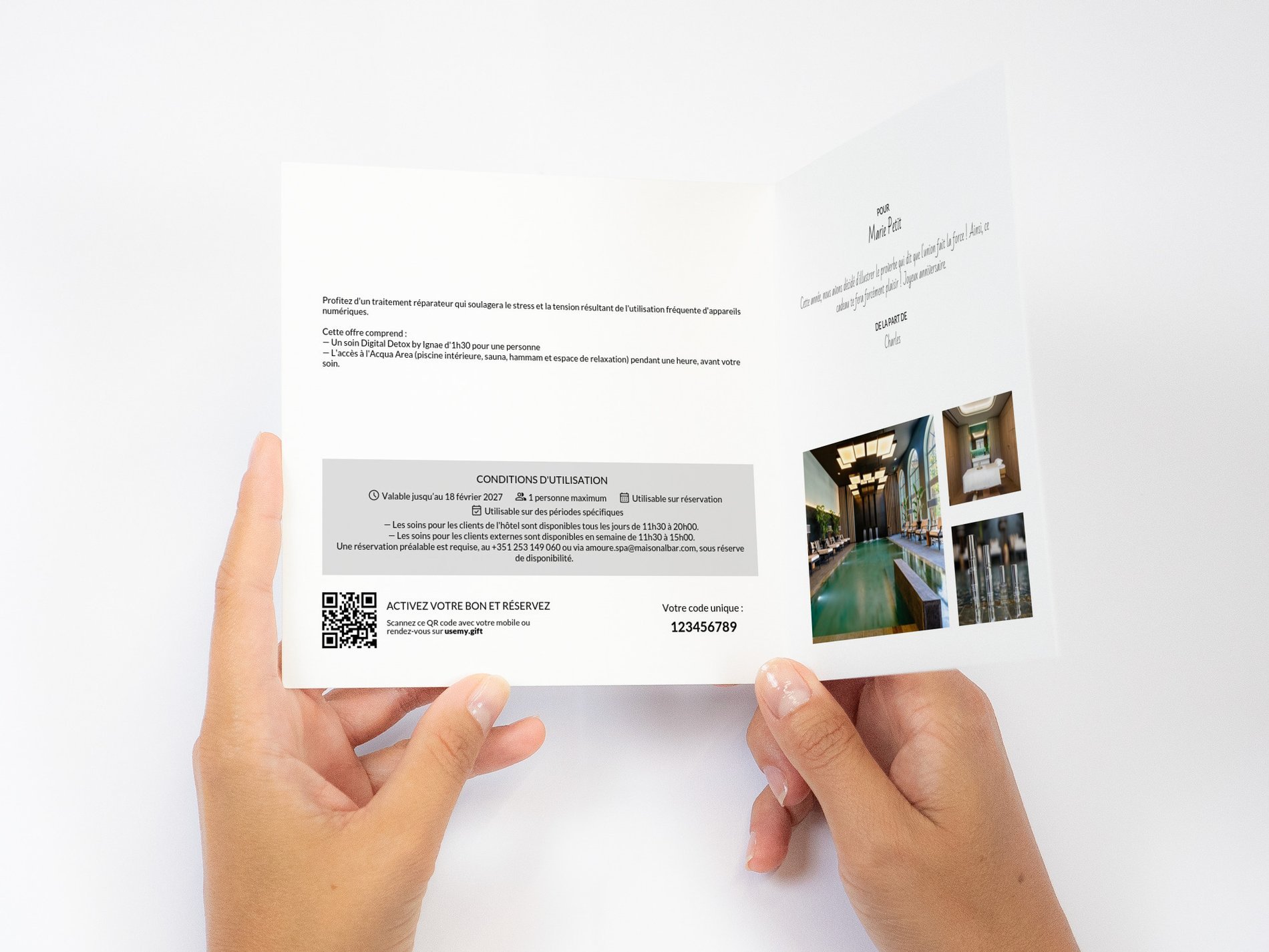 Faites plaisir à vos proches avec une immersion bien-être au Spa Amoure. Des bienfaits de l’eau à la chaleur enveloppante du hammam et du sauna, en passant par des soins d’exception, chaque moment devient une invitation à la sérénité. Offrez un bon cadeau pour une expérience unique hors du temps, où détente et raffinement se rencontrent.